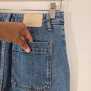 This Everlane piece is made of a mid wash, stretch cotton fabric, and is their The Wide Leg Jean. It is a pair of high rise, mid wash, wide leg jeans in an ankle length, with a zippered fly, 2 front slit pockets, 2 back patch pockets, and faux "cuff' seaming detail on the hems. The perfect transitional, fall staple piece for your closet!