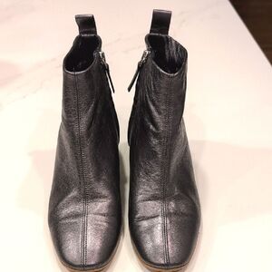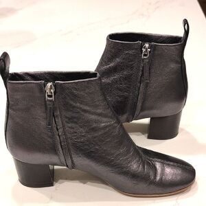 Everlane The Day Ankle Boot in Metallic Gun Metal Gray. These boots feature buttery soft Italian leather, covered side zipper, stacked block heel, leather back pull tab, almond toe, and a double stitched seam in the front. Ankle height with a 2" heel. 100% Italian leather. Size 7.