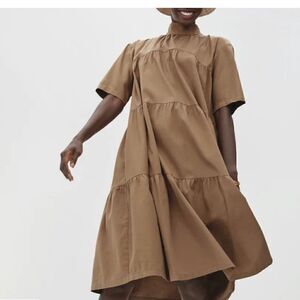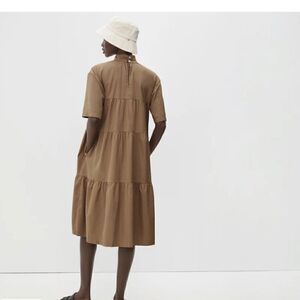 Everlane The tiered mockneck dress brown color xxs has a tiny hole on neck shown in picture other then that in great condition no stains has two buttons on back neck 2 pockets