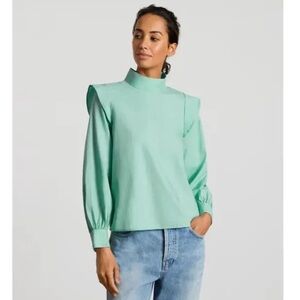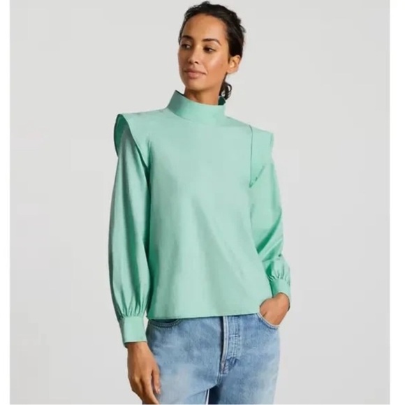 Everlane Women’s blouse with ruffle detail in jade green size 2. Mock-neck design. Perfect for the office or home. You can dress it up with work pants and a jacket or wear it with jeans for a more casual look. This top is definitely “Business Casual”.