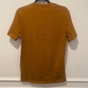 Everlane Uniform organic cotton t-shirt in men's size small. Mustard yellow/golden amber color with crew neck and short sleeves. Made from 100% organic cotton grown in Sri Lanka. Features small embroidered "E" logo at hem. Classic minimalist design perfect for everyday wear. Excellent used condition with no visible flaws.