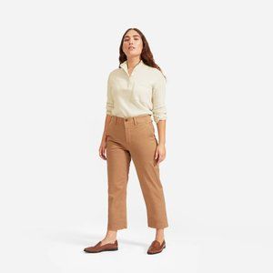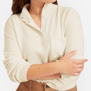 Elegant cream sweater with a ribbed collar. Features a button-up front. Soft and comfortable fabric.