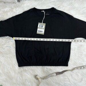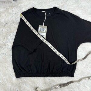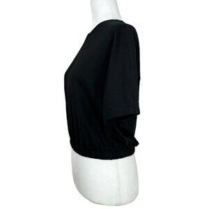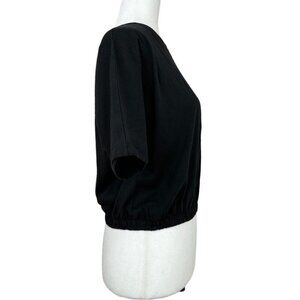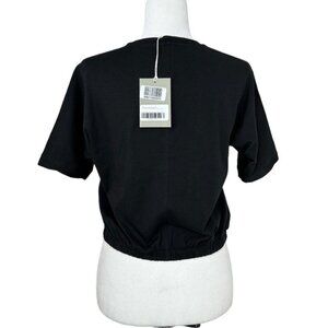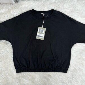 Everlane women's small top, it is The Bubble Tee style, color is muted black, cropped, short cuffable casual sleeves, crew-neckline, elastic hem, lightweight, cute intentional seam down front/back, relaxed and slightly oversized. Materials 100% organic cotton. Care machine wash cold tumble dry low. Condition is new with tags as shown in pictures. Please preview the measurements to ensure fit.