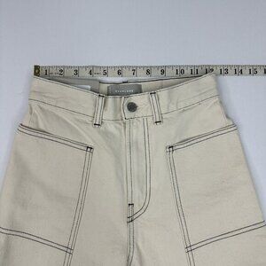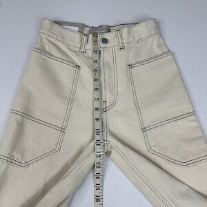 Everlane women's size 23, these are The Gardner Pant style, color is ECRU, wide leg, thick denim, flattering style, open cargo side pockets, stretchy, belt loops, button and zip closure. Materials 100% organic cotton. Care machine wash cold lay flat to dry to preserve fabric. Condition is new with tags with pin-size stains near the knee as shown in pictures. Please preview the measurements to ensure fit.