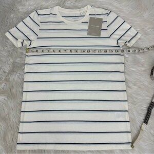 Everlane women's small t-shirt, it is The Organic Cotton Tee style, white with light and dark blue stripes, short sleeves, crew-neckline, stretchy, lightweight and soft. Materials 100% organic cotton. Care machine wash cold tumble dry low. Condition is new with tags with two stains as shown in pictures. Please preview the measurements to ensure fit.