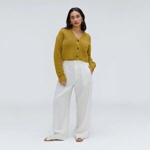 This is a warm alpaca/merino blend wool cardigan. Used in great condition. Extra button still intact on tag! Photos are accurate for color - it's a dijon mustard color with a hint of green. Very pretty with navy or dark denim!