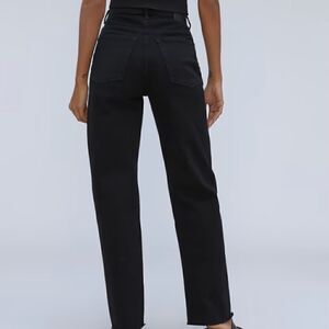 Straight leg. Sits high at waist. Rise: 12 1/8”. Leg opening: 16 1/2” (size 28).