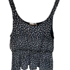 This stylish tank top features a scoop neckline and is designed in a chic black and white color scheme. The sleeveless design is complemented by a cropped fit and a peplum-style bottom with a ruffled hem, adding a feminine touch to your outfit.