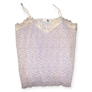 Lace trims a boxy fit cami with a V-neck silhouette.