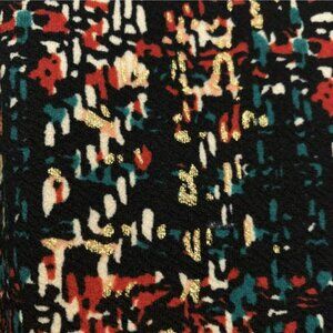 This is a cool fall style long pencil skirt from Everleigh. It’s a multicolor abstract print with red, green, gold, white, and black accents. It’s a pull-on skirt, lined with a black slip and has a small slit in back.
