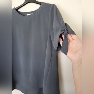 Classy and sophisticated blouse top with cute bows on the sleeves and a tailored sleek fit. Color is a cement charcoal gray. Extra long length. Great condition. Tagged size medium measures approximately 28 inches long 20.5 inches underarm to underarm laid flat.