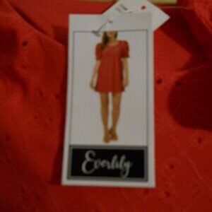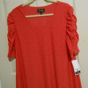 Lovely geranium color, eyelet dress, lined, pull on with ruched sleeves, 38 inches long. Never worn.