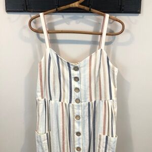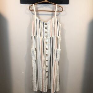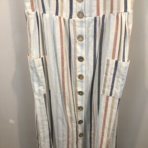 Everlily striped linen blend sundress size large. It has pockets and wooden buttons. The approx measurements are armpit to armpit is 19.5 inches and the length from shoulder to hem is 46.5 inches. It is in great condition.