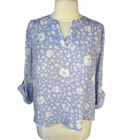 Everly Blouse Shirt Womens Medium Purple White Floral Rolled 1/4 Sleeves