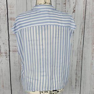 Item: Everly Blue & White Striped Small Oversized Button Down Loose Fit Shirt Blouse. So CUTE! Thin and comfortable. Casual and chic. Material is thin and lightweight.
