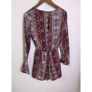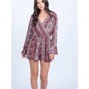 Everly Boho Floral Wrap Romper Burgundy Pink Paisley Long Bell Sleeve Size M