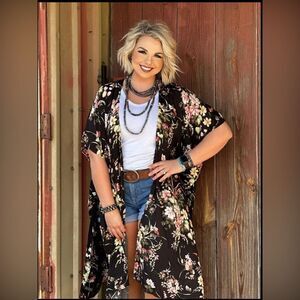 Everly- Black Floral Print, Short Sleeve, 3/4 Length, Open Front Shaw Collar, Chiffon Kimono High/ Low w/ Rounded Back Hem. Women’s size M.