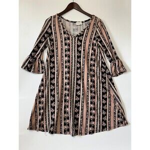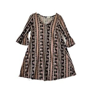 Everly Dress Medium Black Pink Floral Roses 3/4 Sleeve Flare Bell Boho Girly