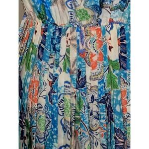 Colorful printed dress has faux pearl buttons on the front. Pleated skirt. Sleeveless. Unlined.