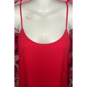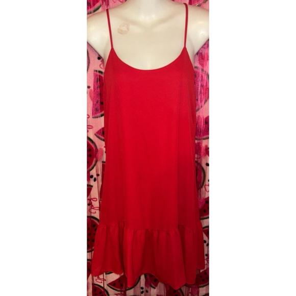 This vibrant red mini dress by Everly features a sleeveless camisole style with a charming ruffled hem and adjustable straps. Its lightweight and flowy fabric make it an ideal choice for warm weather, offering both comfort and elegance. In great condition