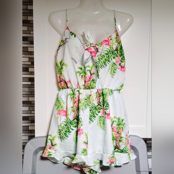 Everly blue Floral spaghetti strap Romper. Size tag missing Waist is 12" and from pit to pit 15.5 ".