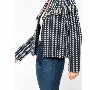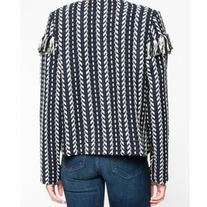 Everly Tweed Fringe Jacket Woven in Blue, Black and White, Size Medium