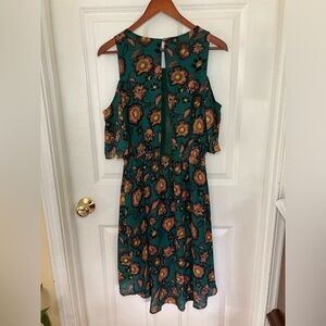 Cute dress for a wedding or date night, with flirty cold shoulders and floaty material. Hi-low bottom hem adds some extra fun!