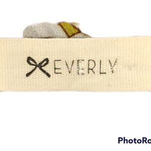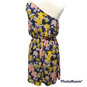 Woven navy blue chiffon is whimsically illustrated with a pink, yellow, and green floral print that glides into an asymmetrical neckline, and gathers at elastic waistband. Fully lined