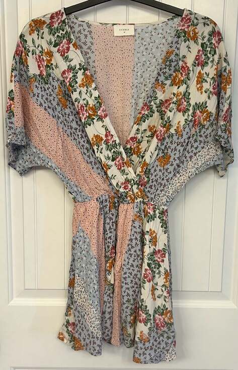 Everly Patchwork Floral Romper, Size Small — Vibrant v-neck design with mixed floral and polka dot prints.