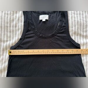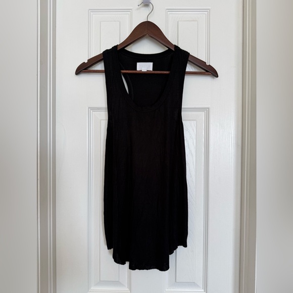 Lightweight black tank with a racerback design. Soft drape and relaxed silhouette. Easy to pair with layers or jeans.