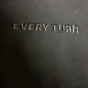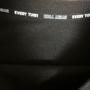 Stylish colorblock sweatshirt with black, gray, and white sections. Features 'Every Turn' text on the front.