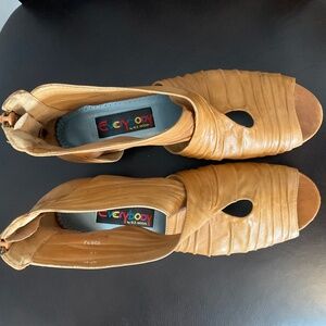 Very soft leather. Color is “opal”. Zipper in back. Open toe. Only worn once. Original box. Very comfortable and goes with everything.