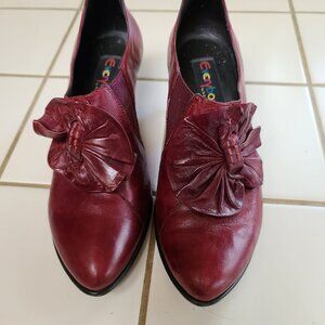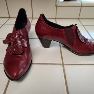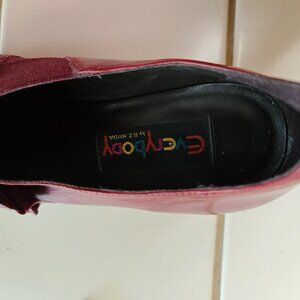 Everybody Novarra style 14392 Italian leather ankle shoetie, Italian size 39 (fits size 9 US). 2 3/8" heel, 3 1/2 inch across at widest point on bottom sole. Buttery soft burgundy red Italian leather with bow design, elastic stretch section on one side. From my personal closet. Minimal wear on heel and sole (worn twice). I wear a size 9 m and these fit well. Purchased from boutique shoe store and stored in covered shoe container. No box. I have described it as carefully as possible but review photos carefully before purchase.