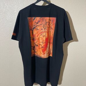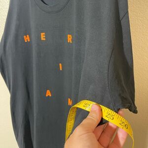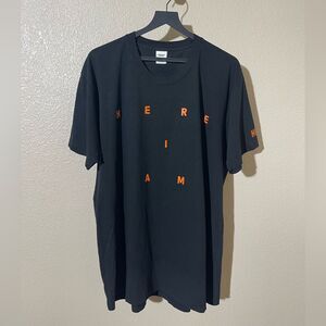 Stylish black t-shirt featuring bold orange lettering. Perfect for casual wear.