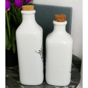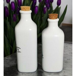 Elegant porcelain bottles for oils, vinegar, or decorative purposes. Dishwasher and microwave safe for convenient use. Cork stoppers for secure closure. Fitz and Floyd Everyday White Bistro Oil Vinegar Bottles Farmhouse Decor