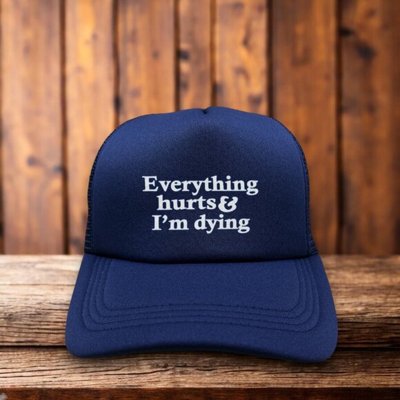 Everything Hurts And I'm Dying Unisex Trucker Hat Navy Funny Meme Anti-Social