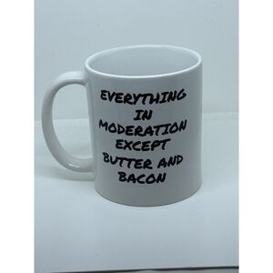 Description: Start your morning with a smile (and maybe some bacon!) with this "Everything in Moderation Except Butter and Bacon" ceramic coffee mug. A perfect gift for anyone who loves breakfast, bacon, and good humor, this mug brings personality to your morning routine. Durable and easy to clean, it's great for home, office, or kitchen display. Perfect for birthdays, holidays, or as a fun surprise for your favorite bacon lover or foodie friend. funny bacon mug, butter and bacon quote cup, bacon lover gift, breakfast coffee mug, foodie humor mug, kitchen decor gift, ceramic mug with quote, butter bacon coffee cup, novelty gift for men, bacon enthusiast present, farmhouse style mug, funny coffee cup, bacon breakfast gift idea, cook lover mug, chef humor drinkware. Notes: Thanks for your interest! Please see photos for measurements and additional details, and let us know if you have any questions. Shipping & Handling: Quick and careful shipping! We package items very carefully and ship daily. Discounted shipping on multiple items.