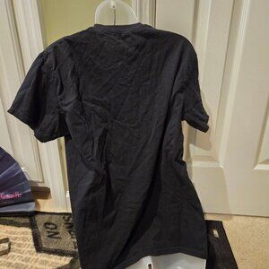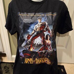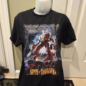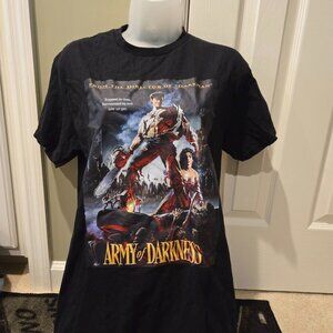 Evil Dead Army of Darkness Movie Poster Graphic T-Shirt Size Medium - thick graphic on shirt, men's style but unisex. Scoop neck, short sleeves, black with graphic on front of the army of darkness poster with Ash in medieval times with his chainsaw. Bruce Campbell. Evil Dead horror movie series franchise. Halloween. Gildan.