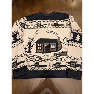 Keywords: Evil Dead, chainsaw sweater, horror Christmas, ugly sweater, cabin in the woods, novelty, cult horror, funny pullover, Halloween sweater, holiday horror aesthetic