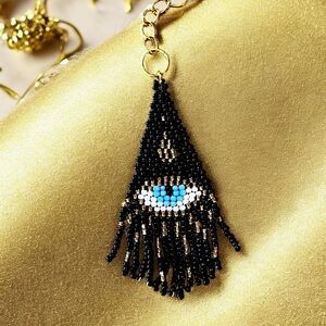 Stylish beaded bag charm featuring an evil eye design. Black, gold, and blue glass beads with a gold toned clasp. Size see picture with US quarter. Red purse is not included in listing. Red purse is a prop to show how cute the charm looks on your purse.