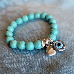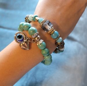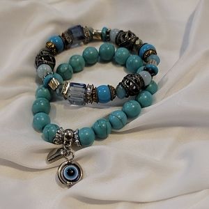 Blue/Turquoise bead bracelets, one with evil eye charm and heart charm. Please see pictures for detail and condition