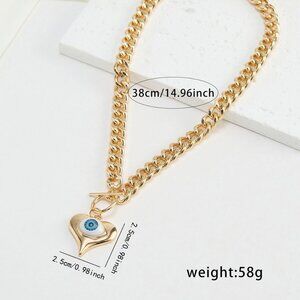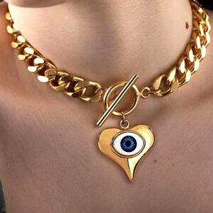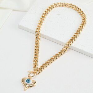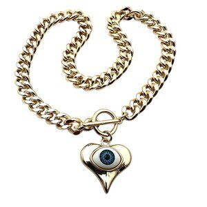 Elegant Evil Eye Heart Pendant Necklace with gold tone finish and a toggle clasp on a 15-inch chain. Perfect for adding a touch of mystical charm to any outfit. New condition.