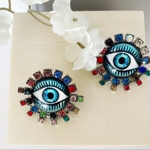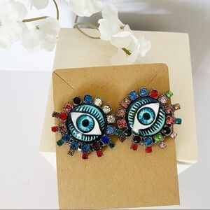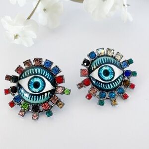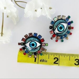 Blue evil eye with multi colored, rainbow rhinestones Earrings