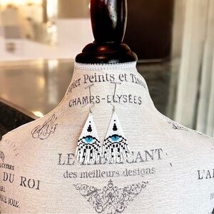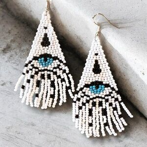 Evil Eye Seed Bead Fringe Earrings: Boho Dangle Earrings Handcrafted White Blue
