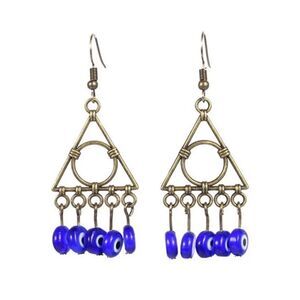 Guard yourself from misfortune with protective evil eye drop earrings. Bronze tone with triangle and circle geometric design (reminiscent of Harry Potter Deathly Hallows). Cobalt blue evil eye beads dangle. French hook. Brand new boutique item. Photos are a part of the description. Color may vary with lighting or device.