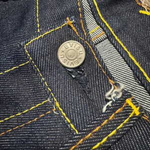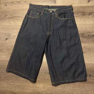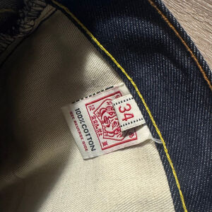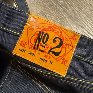 These Evisu No. 2 Lot 0001 denim shorts, size 34, feature a dark indigo wash with yellow stitching. The back showcases white painted graphics: the Evisu seagull logo on one pocket and a skeleton holding a flower on the other. The shorts are made of 100% cotton. The button closure is engraved with the Evisu logo. The shorts are in good condition.