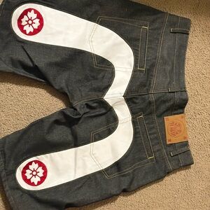 Pretty cool Evisu denim shorts with unique graphic print I got recently I kind of just threw out of them. I kinda need the money. I spent a lot of money on these if you’re wondering where I got them from I got them from eBay. They’re pretty cool and nice short. I’m pretty sure they’re made in Japan, but they fit pretty good #denimshorts #Y2K #BaggyJeans #Vintage #Streetwear