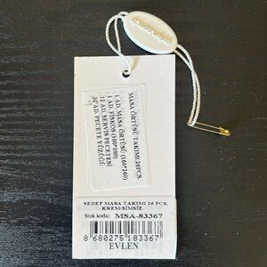 Evlen Home Collection in off white. Elegant design, 23 pieces dining table cloth with tulle and lace trimmings. 1 rectangular piece 160 * 260 cm, 1 square piece 100 * 100 cm, 12 handkerchiefs and 9 handkerchiefs rings.