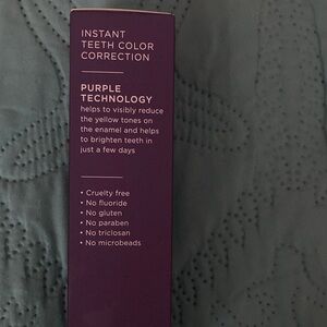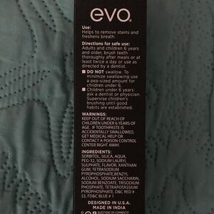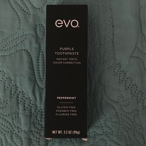 Evo purple toothpaste for instant teeth color correction. Peppermint flavor. Gluten-free, paraben-free, fluoride-free.