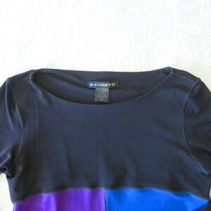 EvoVotto Color Block Tunic Top is in very good used condition. Size Small, top is 92% Polyester and 8% spandex, colors of black, purple and blue. Hand wash and lay flat to dry. Handcrafted in the USA.